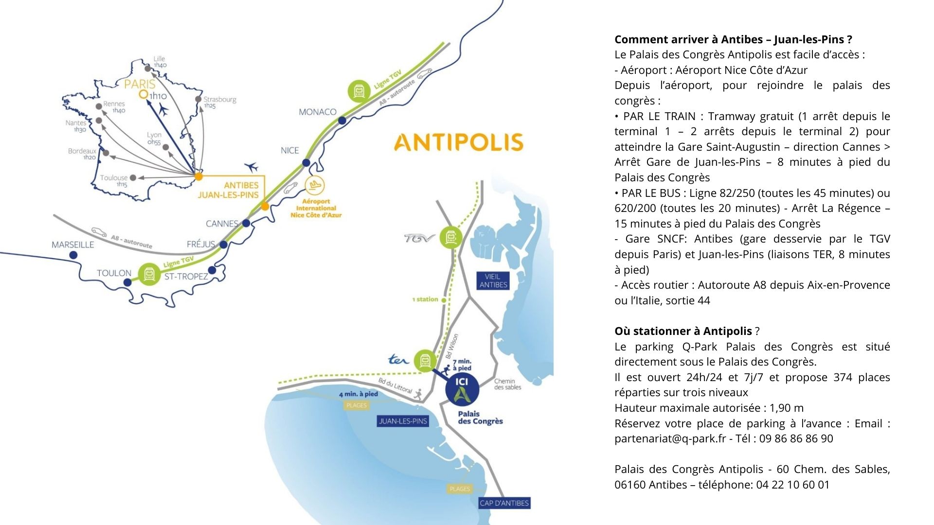 Le Palais des Congrès Antipolis, notre lieu de réunion, nous offrira un cadre idéal. Moderne et élégant, il est situé en plein cœur de Juan-les-Pins, face à la pinède, à deux pas des hôtels et à quelques mètres seulement de la mer.
